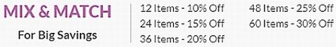 With Mix & Match, you can buy 12 different items, and still get 10% off your entire order. Buy 24, get 15% off. You can save up to 30% off your entire order (60 items).